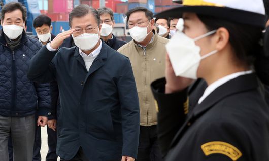 문재인 대통령이 25일 가덕도 공항 예정지 선상 시찰을 마치고 부산신항 다목적부두에 위치한 해양대학교 실습선으로 이동하며 해양대 학생들의 경례를 받고 있다. 연합뉴스 |