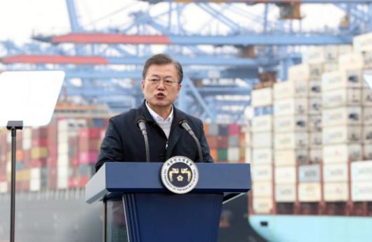 문재인 대통령이 25일 부산신항 다목적 부두에 위치한 해양대학교 실습선 선상에서 열린 '동남권 메가시티 구축 전략 보고'에서 발언하고 있다. / 사진=연합뉴스 |