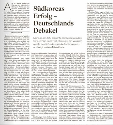 독일 최대 규모 일간지 중 하나인 디벨트는 최근 '한국의 성공, 독일의 패배'라는 제목하에 독일의 코로나19 검사전략을 비판했다.