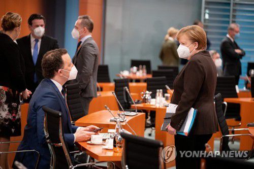 대화나누는 앙겔라 메르켈 독일 총리와 옌스 슈판 독일 보건장관[로이터=연합뉴스] |