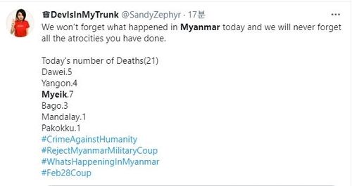 28일 미얀마 최대도시 양곤에서 첫 사망자가 나온 것을 비롯해 전국에서 최소 7명이 목숨을 잃는 등 군부 쿠데타 이후 최악의 유혈사태가 벌어졌다. 쿠데타 한 달을 맞으면서 국내외의 압박이 커지고 있지만 군사정권은 오히려 대응 수위를 더 높이면서 인명피해가 커지고 있다.