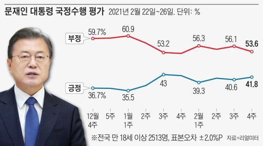 여론조사업체 리얼미터가 YTN 의뢰로 지난달 22일~26일 전국 유권자 2513명을 대상으로 실시한 조사에서 문 대통령의 국정수행 긍정평가는 전주보다 1.2%포인트 오른 41.8%로 나타났다. 부정평가는 2.5%포인트 하락한 53.6%였다. 긍정평가와 부정평가의 차이는 11.8%였다.
