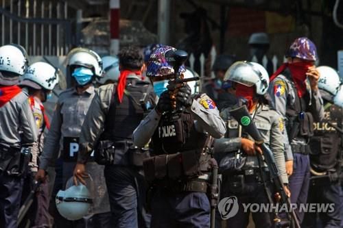 미얀마 경찰이 양곤에서 시위대를 향해 고무탄을 쏘고 있다. 2021.2.28 |