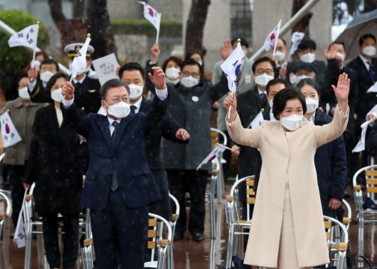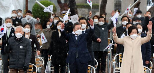문재인 대통령과 영부인 김정숙 여사가 1일 서울 종로구 탑골공원에서 열린 제102주년 3·1절 기념식에서 만세삼창을 하고 있다. 이날 문 대통령은 기념사를 통해 “우리 정부는 언제든지 일본 정부와 마주 앉아 대화할 준비가 돼 있다”면서 “역지사지 자세로 머리를 맞대면 과거 문제도 얼마든지 현명하게 해결할 수 있을 것”이라고 말했다.