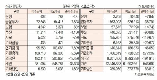 [표]주간 유가증권·코스닥 투자주체별 매매동향(2월 22일~26일)