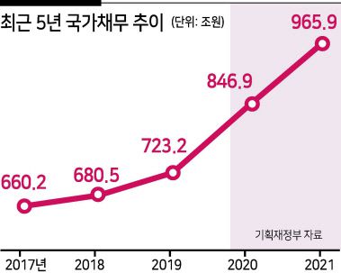 2일 기획재정부가 발표한 2차 맞춤형 피해지원대책을 위한 추경안에 따르면 정부는 올해 국가채무 전망을 기존 956조원에서 965조9000억원으로 늘렸다. 19조5000억원 규모에 달하는 4차 재난지원금을 위해 추가로 빚을 낸 것이다. 국내총생산(GDP) 대비 국가채무 비율은 47.3%에서 48.2%로 늘어난다.