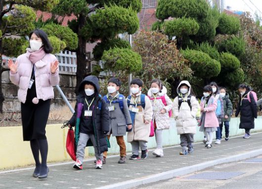2일 오전 부산 동래구의 한 초등학교에서 입학생들이 선생님의 안내에 따라 줄지어 교실로 들어가고 있다. 연합뉴스 |