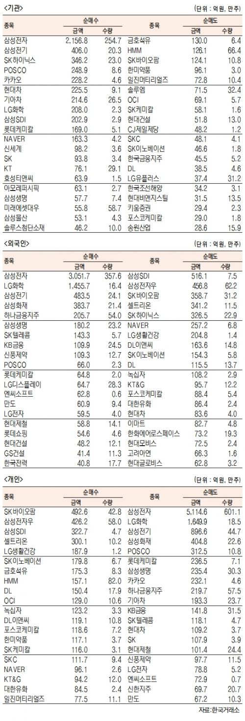 [표]유가증권 기관·외국인·개인 순매수·도 상위종목(3월 2일-최종치)
