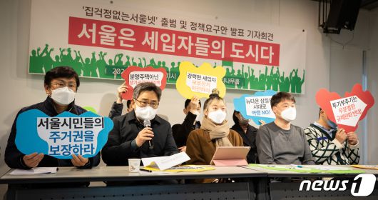 (서울=뉴스1) 유승관 기자 = 집걱정없는 서울만들기 선거네트워크 회원들이 3일 서울 종로구 참여연대에서 '집걱정없는서울넷' 출범 및 정책요구안 발표 기자회견을 열고 서울시장 보궐선거를 앞둔 여야 후보들에게 투기 규제 및 세입자 보호 강화, 공공임대주택 공급 확대 정책 등을 제안하고 있다. 2021.3.3/뉴스1