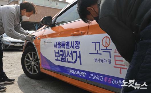 서울특별시선거관리위원회가 3일 서울 성북구 대왕 기업 택시 차고지에서 보궐선거일을 알리고 유권자의 투표참여를 독려하기 위해 택시에 홍보 래핑을 실시하고 있다.