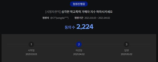 청원자는 “입에 담을 수 없는 극악무도한 학교 폭력(폭행은 기본, 금품 갈취에 성폭행, 성추행, 리밴지포르노 등)을 행사한 ‘달이 뜨는 강’의 지수 하차 시키세요. 만약 하차시키지 않는다면 국민방송이 해당 범죄에 대하여 묵인한다는 뜻으로 받아들이겠습니다”고 밝혔다.