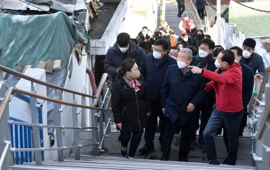 김종인 국민의힘 비상대책위원장이 3일 서울 용산구 서계동 일대를 방문해 도시재생사업 현장을 둘러보고 있다. 공동취재사진 |