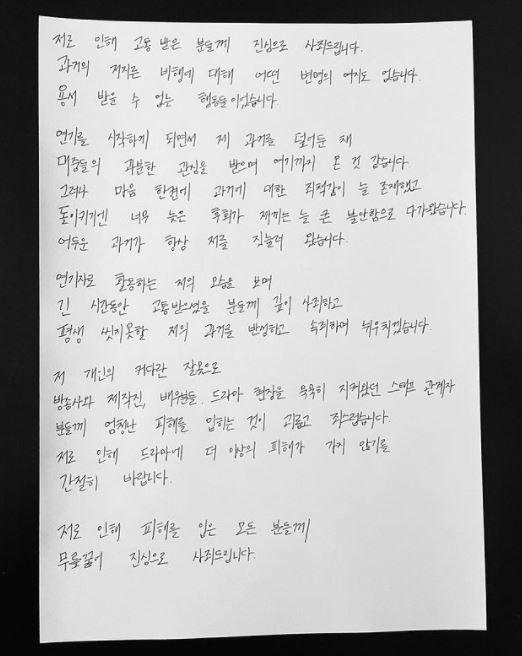 저 개인의 커다란 잘못으로방송사와 제작진, 배우들, 드라마 현장을묵묵히 지켜왔던 스태프 관계자분들에게엄청난 피해를 입히는 것이 괴롭고 죄스럽습니다.저로 인해 드라마에 더 이상의피해가 가지 않기를 간절히 바랍니다.