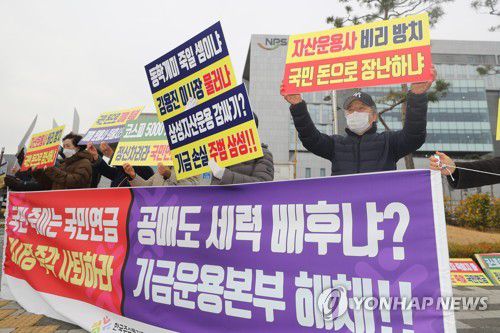 (전주=연합뉴스) 정경재 기자 = 개인 주식투자자 권익보호단체인 한국주식투자자연합회(이하 한투연)는 4일 오전 전북혁신도시에 있는 국민연금공단 기금운용본부 앞에서 기자회견을 열고 "국민연금은 주가 하락의 주범"이라고 주장했다.