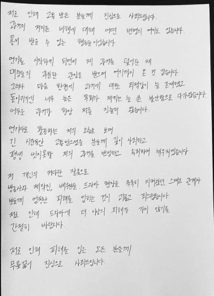 지수는 "내 커다란 잘못으로 방송사와 제작진, 배우들, 드라마 현장을 묵묵히 지켜왔던 스태프 관계자분들에게 엄청난 피해를 입히는 것이 괴롭고 죄스럽다. 나로 인해 드라마에 더 이상의 피해가 가지 않기를 간절히 바란다"라며 '달이 뜨는 강' 제작진과 출연진에 대해 사과하기도 했다.