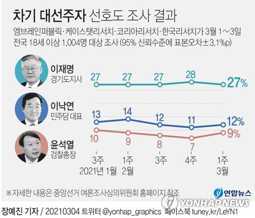 (서울=연합뉴스) 고동욱 기자 = 이재명 경기도지사와 더불어민주당 이낙연 대표, 윤석열 검찰총장의 대권 지지율 격차가 약간 좁혀졌다는 여론조사 결과가 4일 나왔다.