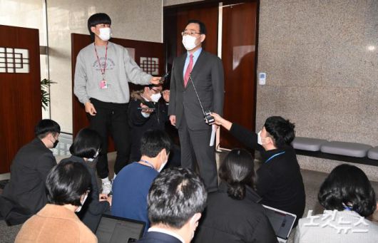 CBS노컷뉴스 윤창원 기자 주호영 국민의힘 원내대표가 4일 국회에서 윤석열 검찰총장의 사퇴와 관련해 취재진의 질문에 답하고 있다.저작권자 © CBS 노컷뉴스 무단전재 및 재배포 금지