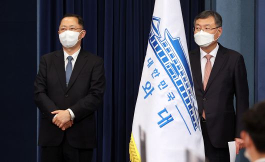 4일 임명된 김진국 대통령비서실 민정수석비서관(왼쪽)이 청와대 춘추관에서 인사말을 하기 위해 전임 신현수 수석과 대기하고 있다. [연합] |