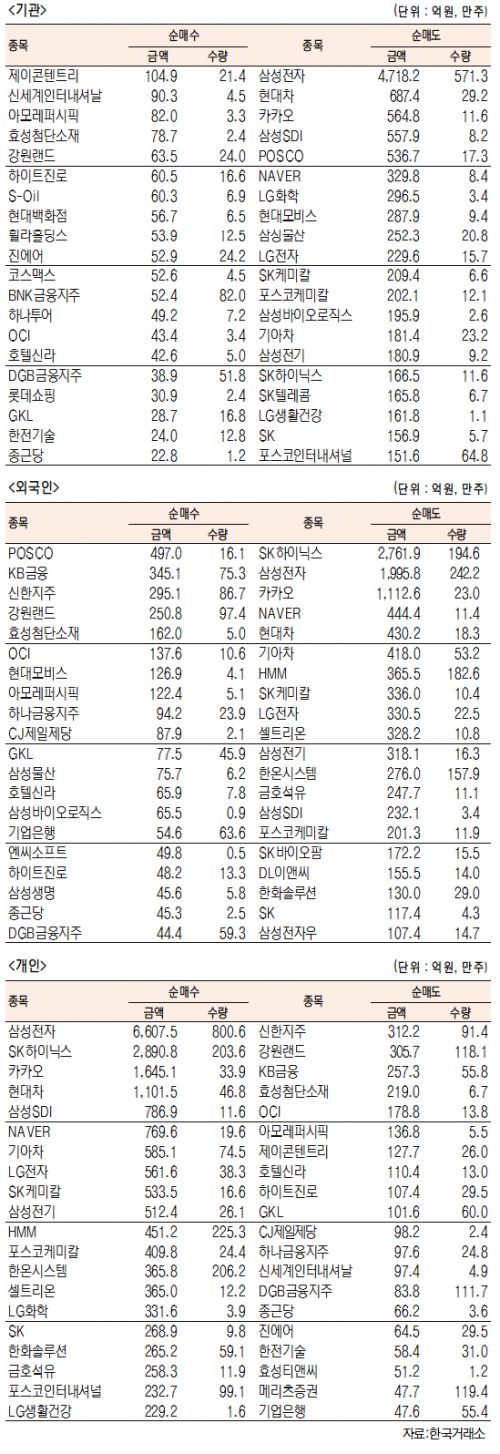[표]유가증권 기관·외국인·개인 순매수·도 상위종목(3월 4일-최종치)