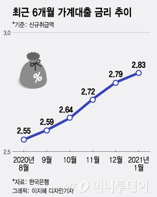4일 한국은행에 따르면 신규취급액 기준 가계대출 금리는 지난 1월 2.83%로 전월대비 0.04%포인트 올랐다. 5개월 연속 상승 곡선을 그렸다. 6개월 전과 비교해서는 0.21%포인트 올랐다. 가계대출 중 신용대출 금리는 같은 기간 3.46%로 6개월 전보다 0.54%포인트 뛰었다. 주택담보대출의 경우 금리가 2.63%, 6개월 전 대비 상승률은 0.18%포인트로 나타났다.