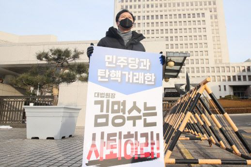 김명수 대법원장 탄핵거래 국민의힘 진상조사단은 5일 성명을 내고 김 대법원장의 사퇴를 압박했다. 진상조사단장을 맡고 있는 김기현 국민의힘 의원이 지난달 서울 서초구 대법원 앞에서 김 대법원장의 사퇴를 촉구하는 1인 시위에 나서기도 했다.(사진=이데일리DB) |