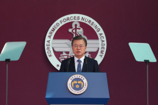 문재인 대통령이 5일 대전광역시 국군간호사관학교에서 열린 제61기 졸업 및 임관식에서 축사 하고 있다. (사진=연합뉴스) |