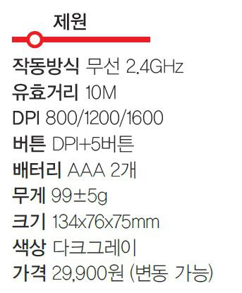 일반 마우스보단 높이가 있는 편이지만 부담 없는 크기로 휴대하기에도 나쁘지 않을 듯하다. 블루투스와 동글 리시버 이용이 모두 가능한 듀얼 무선 모드를 지원하며 DPI도 최대 2400까지 4단계로 변환 가능해 일반 마우스 못지않은 감도와 움직임을 보인다. 게다가 심플하게 사이드 버튼을 둘러싼 RGB 효과가 세로형 마우스의 심심함을 달래주어 오색찬란 불빛을 좋아하는 사용자의 마음을 끈다. USB Type-C 충전식 배터리로, 한 번 충전하면 1일 4시간 사용 기준 약 한 달 정도 사용 가능하다.