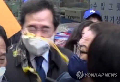 (서울·춘천=연합뉴스) 박영서 강민경 기자 = 더불어민주당 이낙연 대표가 5일 춘천 중앙시장을 방문, 상가 거리를 걷다가 갑자기 날아든 날달걀에 얼굴을 맞았다.