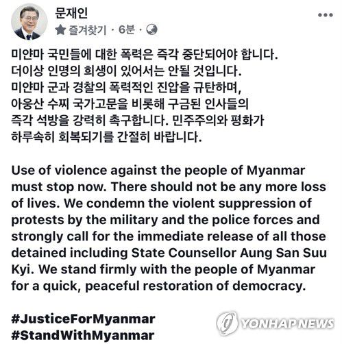 문 대통령은 영어로도 같은 내용의 메시지를 함께 올린 데 이어, 해시태그 '저스티스 포 미얀마'(#JusticeForMyanmar), '스탠드 위드 미얀마'(#standwithmyanmar)도 같이 적었다.