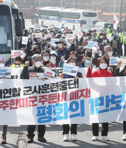 5일 오전 경기도 평택시 캠프 험프리스 윤게이트 앞에서 열린 ‘한미연합군사훈련 중단ㆍ주한미군주둔비 폐지 평화의 1만보 행진 선포 기자회견’을 마친 참가자들이 행진하고 있다(사진=연합뉴스). |