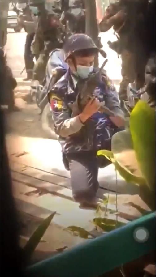 미얀마 경찰이 기관단총에 탄창을 끼우는 모습. 화면 한쪽에 장애물로 인해 까만부분이 드러나 있다.[트위터 캡처] |