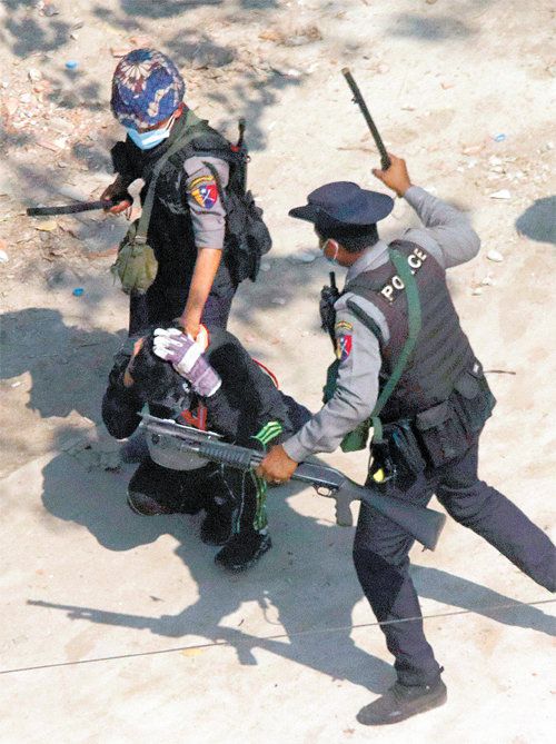 시위대 구타하는 미얀마 군경 6일 미얀마 최대 도시 양곤에서 무장한 군경이 곤봉으로 시위대를 구타하고 있다. 군부 지지자가 시민을 공격하는 ‘백색테러’도 기승을 부려 최소 2명이 숨지고 6명이 부상당했다. 크리스틴 슈라너 부르기너 유엔 미얀마 특사는 시위대 유혈 진압을 비판하며 유엔 안전보장이사회 차원의 대응을 호소했다. 양곤=AP 뉴시스 |