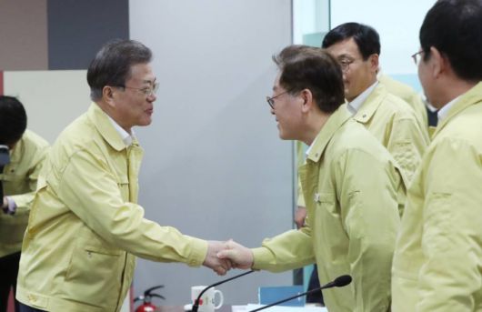 문재인 대통령이 16일 서울 중구 서울시청에서 열린 신종 코로나바이러스 감염증(코로나19) 수도권 방역 대책회의에 참석해 이재명 경기지사와 악수하고 있다. /사진=뉴시스 |