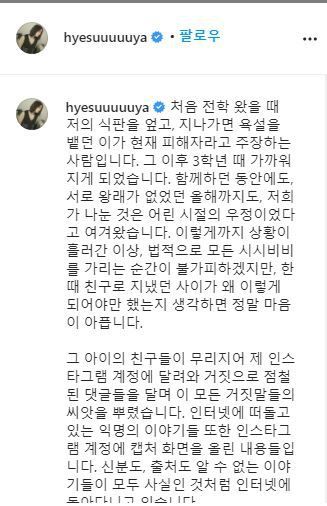 이어 “처음 전학 왔을 때 저의 식판을 엎고, 지나가면 욕설을 뱉던 이가 현재 피해자라고 주장하는 사람이다. 그 이후 3학년 때 가까워지게 되었다. 함께하던 동안에도, 서로 왕래가 없었던 올해까지도, 저희가 나눈 것은 어린 시절의 우정이었다고 여겨왔다”고 말했다.