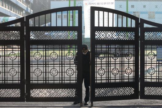 8일 오전 서울 강동구 고덕동 소재 한 고등학교에서 학교 경비원이 교문을 닫고 있다. 서울시교육청에 따르면 이 고등학교 축구클럽 학생 등 15명이 코로나19에 확진된 것으로 확인됐다. 학교 측은 주말 동안 2~3학년 대상 코로나19 전수검사를 실시했고 이날 등교와 교직원 출근도 중지하기로 했다. 뉴스1 |