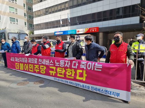 (서울=연합뉴스) 박재현 기자 = 민주노총 서비스연맹 전세버스연대 지부는 8일 여의도 더불어민주당사 앞에서 기자회견을 열고 정부의 4차 재난지원금 지급 대상에 전세버스 노동자를 포함하라고 촉구했다.