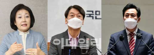 지난달 각종 여론조사에서 박영선(왼쪽) 더불어민주당 후보의 지지율이 야권후보들에 앞섰으나, 이달 들어 안철수(가운데) 국민의당 후보, 오세훈 국민의힘 후보에 오차범위 내에서 따라잡혔다는 새 결과가 나왔다.(사진=이데일리DB) |
