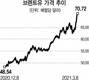 브렌트유는 7일(현지 시간) 런던 선물거래소에서 장중 전장 대비 1.11달러(1.6%) 오른 70.65달러를 기록했다. 지난 2019년 5월 19일 이후 처음으로 70달러 선을 돌파한 것이다. 파이낸설타임스(FT)는 “8일 아시아 시장에서 브렌트유는 2.9% 오른 71.38달러를 기록했고 서부텍사스산원유(WTI) 역시 67.98달러까지 상승했다”고 전했다.
