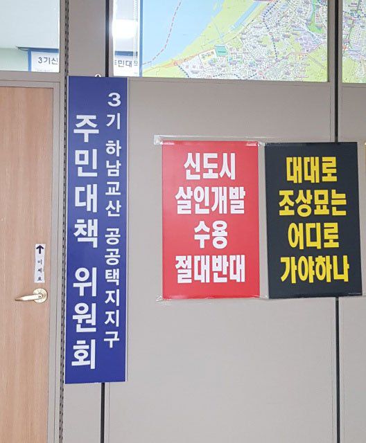 3기 신도시에 편입된 경기도 하남 교산 공공택지지구 주민대책 위원회 사무실 앞에 토지수용을 반대하는 문구들이 나붙어 있다. 사진=박소연 기자 |