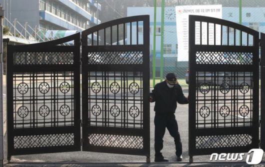 8일 오전 서울 강동구 고덕동 소재 고등학교에서 학교 경비원이 교문을 닫고 있다. 서울시교육청에 따르면 이 고등학교 축구클럽 학생 등 15명이 코로나19에 확진된 것으로 확인됐다. 학교 측은 주말 동안 2~3학년 대상 코로나19 전수검사를 실시했고 이날 등교와 교직원 출근도 중지하기로 했다./사진=뉴스1 |
