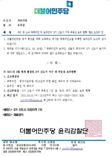 당 윤리감찰단은 이와 관련해 당 소속 국회의원과 보좌진 등에게 공문을 보내 3기 신도시 부동산 보유 현황에 대해 오는 10일 오후 6시까지 회신해 달라고 요청했다.