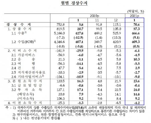 2021년 1월 국제수지(잠정) 중 경상수지 / 자료= 한국은행(2021.03.09) |