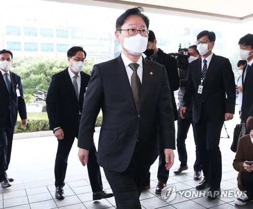 (안산=연합뉴스) 홍기원 기자 = 박범계 법무부 장관이 9일 오전 한국토지주택공사(LH) 직원들의 땅 투기 의혹 수사전담팀을 격려하기 위해 경기도 안산시 단원구 수원지검 안산지청을 방문하고 있다.
