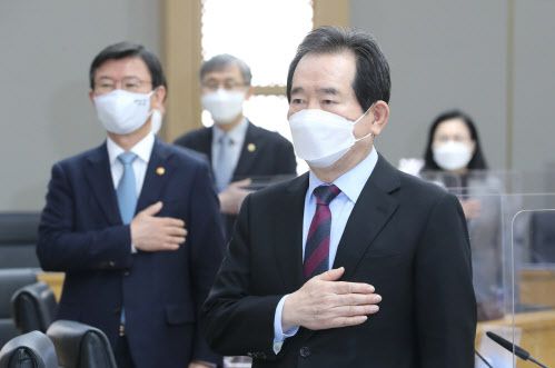 정세균 국무총리가 9일 오전 세종시 정부세종청사에서 열린 국무회의에서 참석한 국무위원들과 국기에 경례하고 있다.(사진=연합뉴스) |
