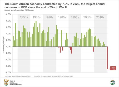 2차세계 대전 후 최대로 감소한 남아공 GDP(맨오른쪽 7.0% 하락그래프) |