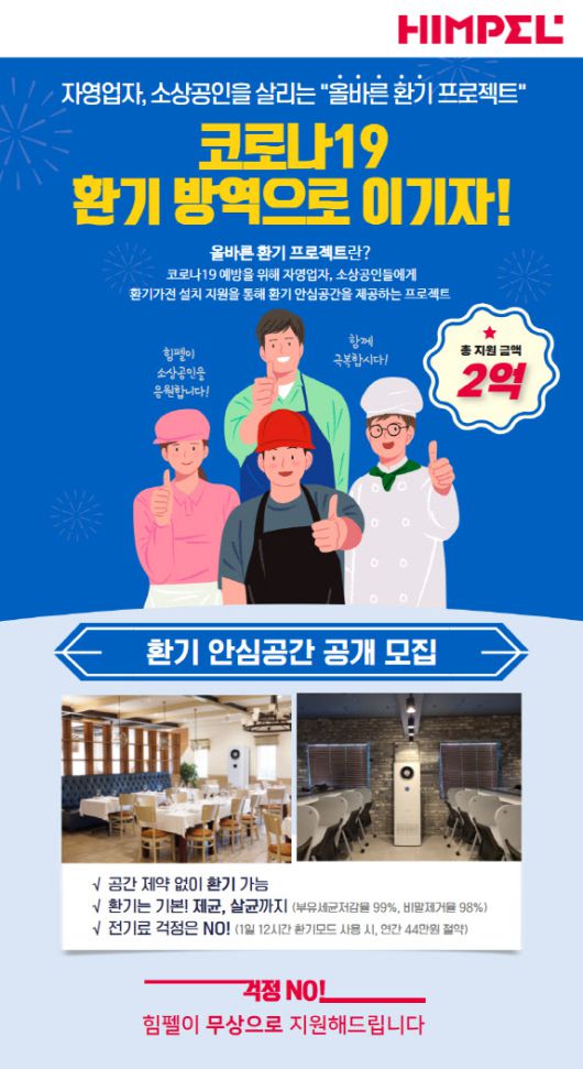 [이데일리 김호준 기자] 환기가전기업 힘펠은 코로나19로 어려운 시기를 보내고 있는 자영업자·소상공인에게 환기가전 설치를 지원하는 ‘올바른 환기프로젝트’를 진행한다고 10일 밝혔다.