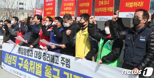 전북민중행동 및 민주노총 전국공공운수사회서비스노조 관계자들이 10일 전북 전주시 전주지방법원 앞에서 '이상직 의원 구속처벌' 촉구 기자회견을 하고 있다. 2021.3.10/뉴스1 © News1 유경석 기자 |