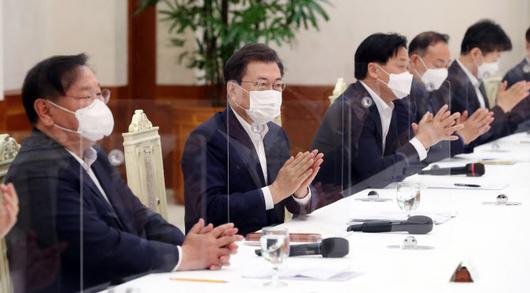 문재인 대통령이 10일 청와대에서 열린 더불어민주당 원내대표단 초청 간담회에 참석, 김태년 당 대표 직무대행 겸 원내대표가 발언을 마치자 박수치고 있다.(사진=연합뉴스) |