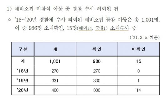 2018년부터 3년간 예비소집에 불참한 아동 1000여명 중 경찰이 아직도 소재를 파악하지 못한 아이가 15명인 것으로 확인됐다. 이 기간 경찰이 영아유기, 방임 등의 혐의로 검찰에 송치한 수사는 총 6건이었다.