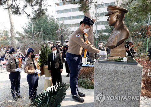 (인천=연합뉴스) 윤태현 기자 = 10일 오후 인천시 연수구 송도고등학교에서 열린 국가보훈처 주관 '제2연평해전 영웅' 고(故) 윤영하 소령 추모행사에서 송도고 해군주니어 ROTC 대원들이 윤 소령 흉상에 헌화하고 있다. 윤 소령은 고속정 참수리-357호 정장으로 서해 북방한계선(NLL)을 수호하다 2002년 6월 29일 오전 10시께 NLL을 침범한 북한 경비정의 기습공격에 맞서 치열한 교전을 벌이다 전사했다. 송도고등학교는 윤 소령의 모교다. 2021.3.10